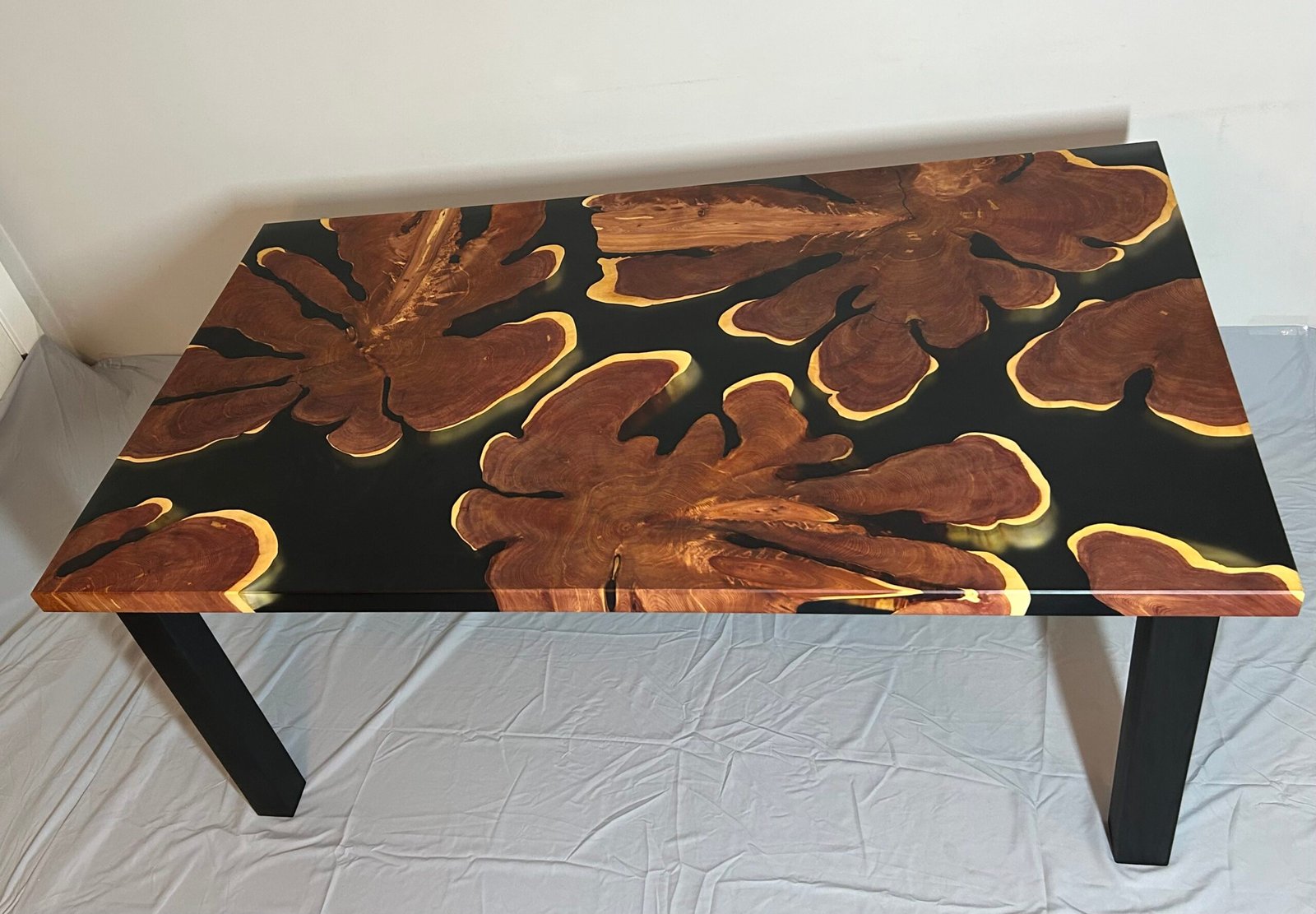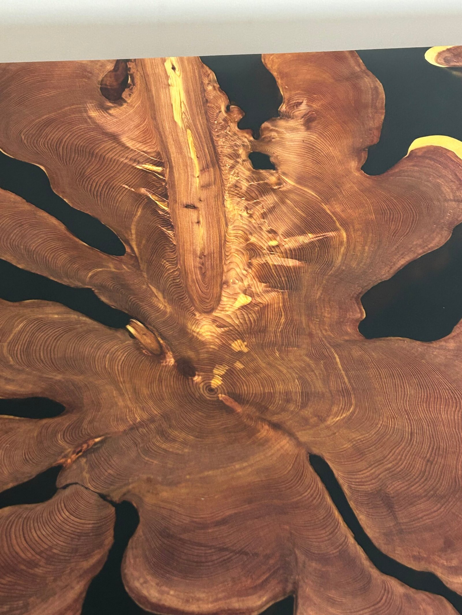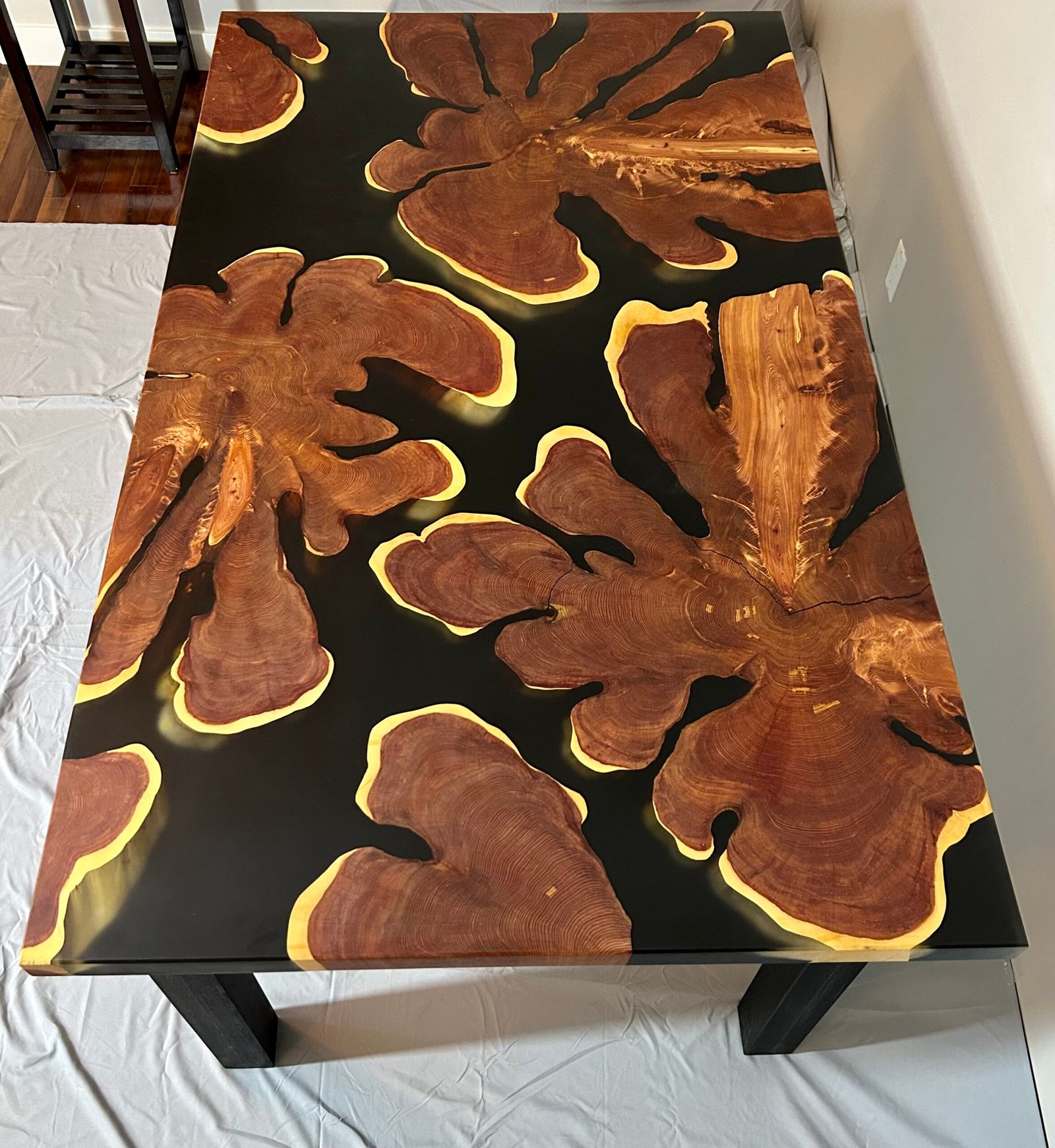 This beautiful dining table / executive desk features vibrant aromatic cedar cookies that were salvaged as a windfall near the southern tip of Vancouver Island. Brought together with a frosted two tone epoxy while sitting atop a sleek and contemporary base made of solid blackened oak this table is sure to command attention! Sitting at 6 feet long by 42 inches wide and 30 inches tall this piece makes a marvellous dining room table or a luxurious executive desk. Ceramic coating greatly reduces the fear of spills or rings left by glasses while also making general cleaning a breeze! Don’t miss out on this piece which embodies the west coast where luxury meets nature at every corner!